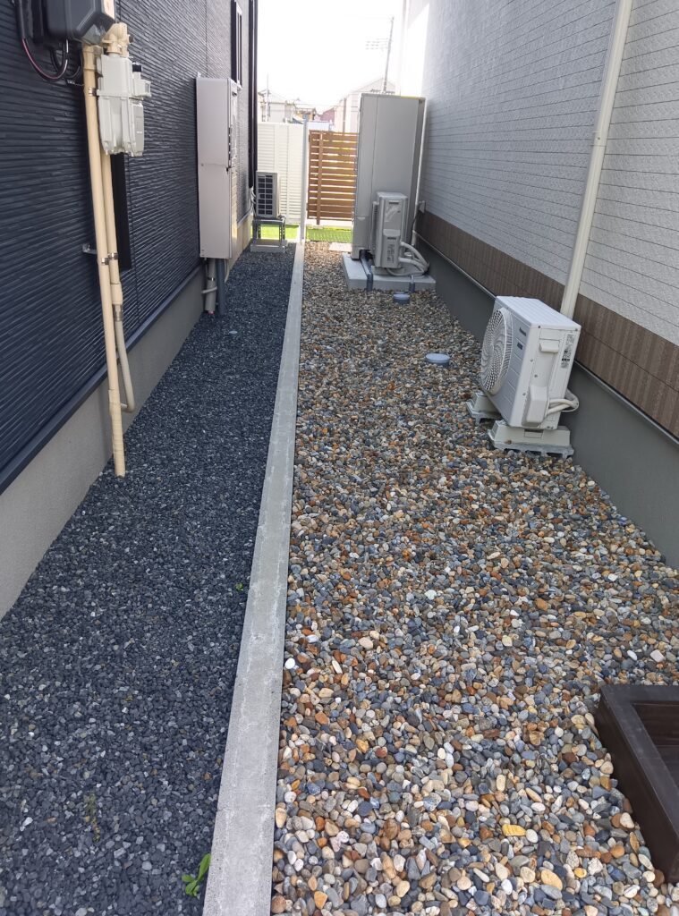 左 黒砕石 右 川砂利 25㎜以下 下地防草シート