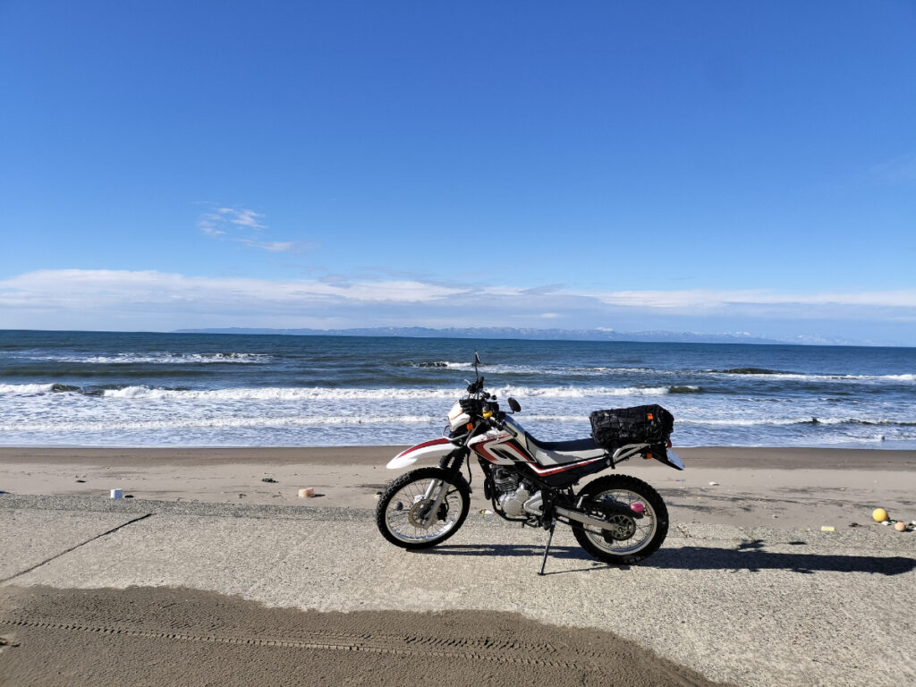 海岸堤防にバイクを停めて、海を眺めながらお湯を沸かしました。