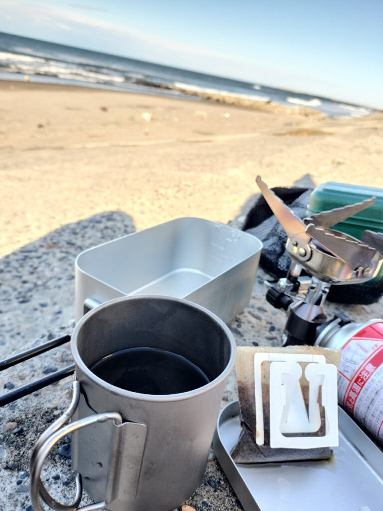 チタンマグに注ぐと湯気の向こうに青い海が広がっていて、それだけで贅沢な時間になります。