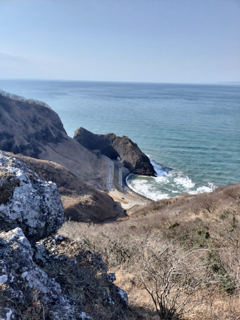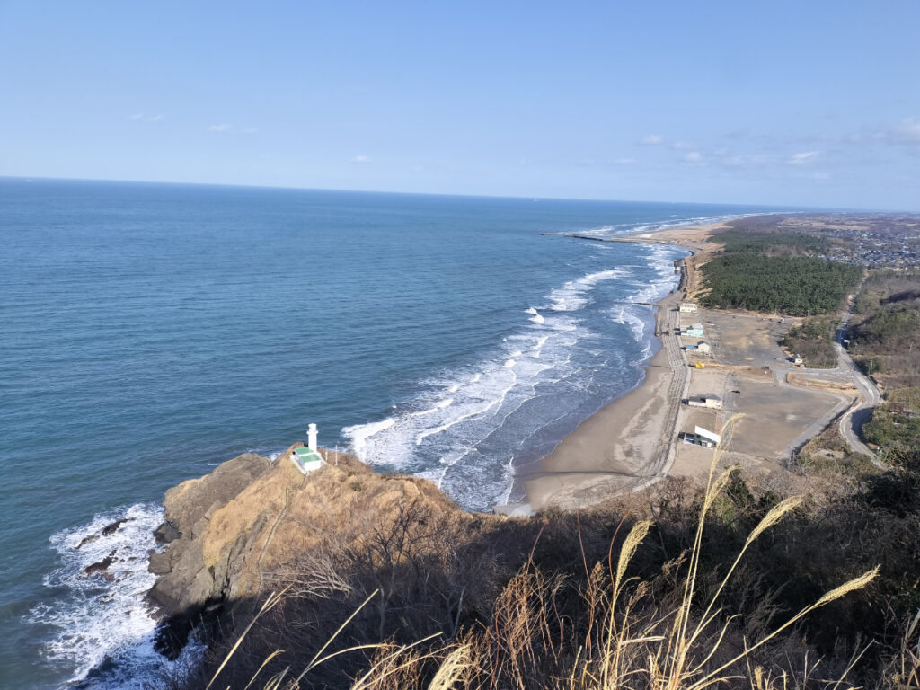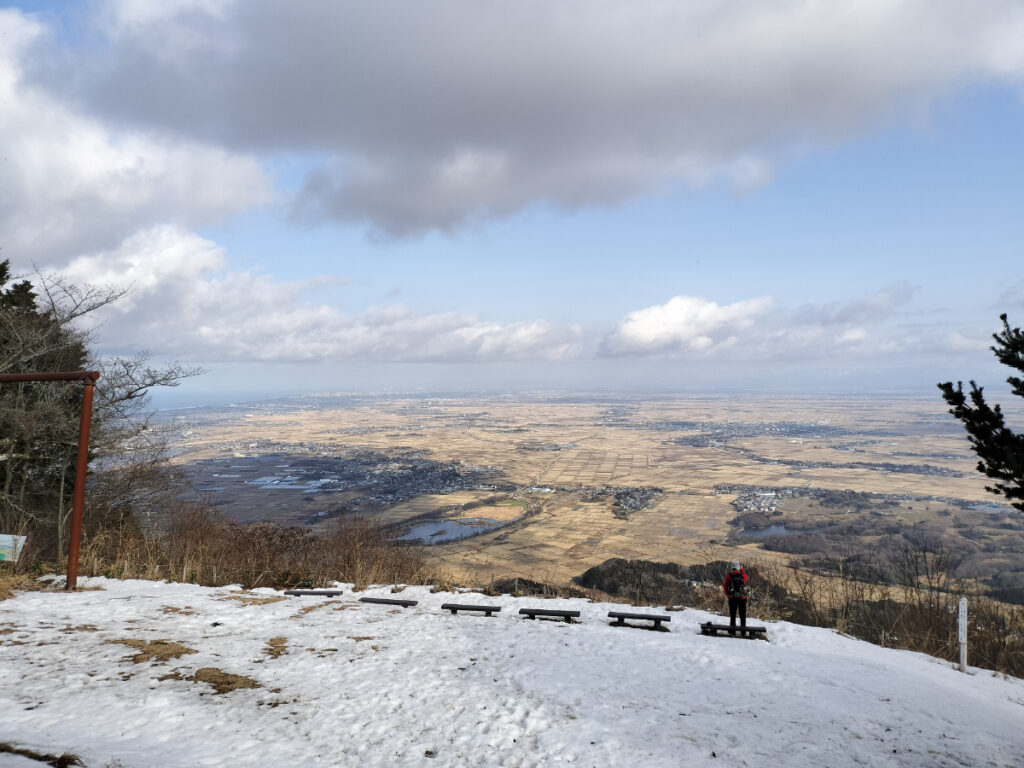 登っていく途中、眼下を走る車がミニカーのように見えたり、日本海に浮かぶ佐渡の稜線がくっきりと見えたり、冬の澄んだ空気ならではの景色が広がっていました。