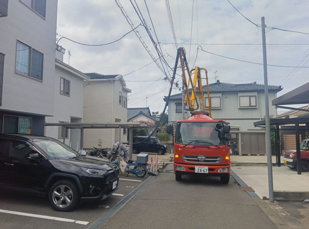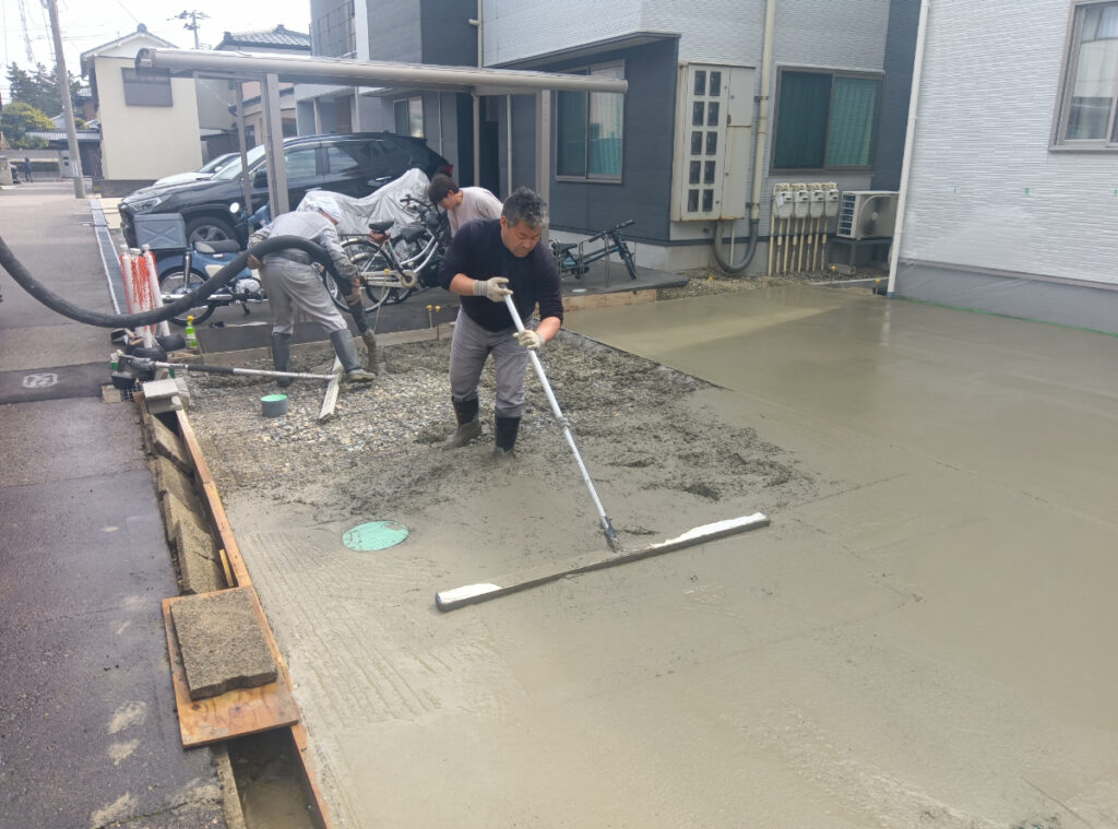 作業の途中でサッと雨が落ちてきて一瞬ヒヤリとしましたが、すぐに止んでくれたおかげで仕上がりへの影響もなく、予定通りきれいに打設を終えることができました。